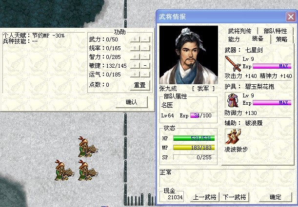 其他人的装备不多说,就说2个人的,九成七星+梨花袍+踏浪履,汤怀震天+柳叶+金镖。战前汤怀我存了800+的功勋,用来+BUFF,其实不需要那么多,能保证一个精神BUFF就可以了,有多的话就再+个运气BUFF,减少SL量。最后的要点,必须保证前5回合天气是晴天。