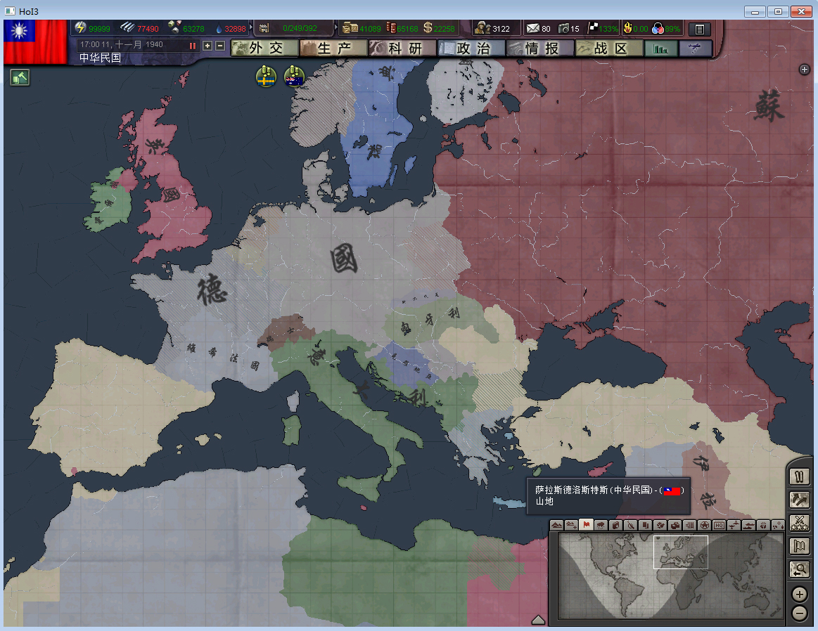 但打阿富汗跟新疆路不通,要在边境修机场,用伞兵占了0基建的无人区又要修几个月的路陆军才能爬过去。最后和大胡子萌国瓜分轴心,地图有点难看