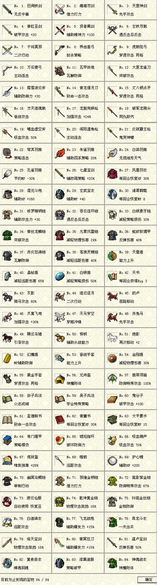 如题,网上找不到图片,正在玩豪曹中,看攻略怎么配装,有些宝物拿到了知道效果,有些只知道名字,效果咋样一头雾水