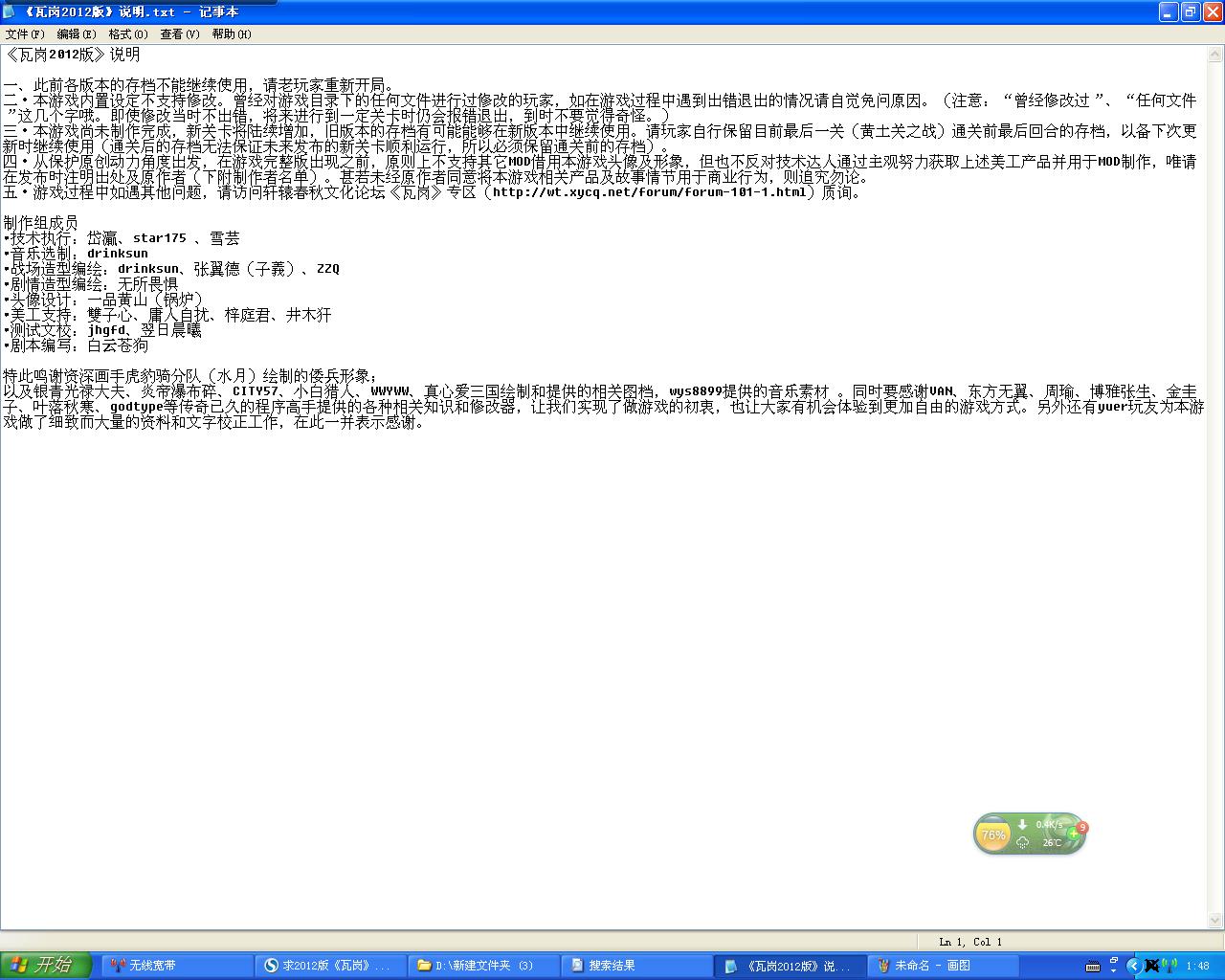 我是2012年底在快玩游戏盒中找到了瓦岗这部游戏,自此接下不解之缘。那是玩的是2011版本。打通了才到网上找新的。在论坛上2012版我下载了,可是不能玩。症状是,打开的时候不弹出,只有右下角有,也打不开。(好歹是官方版本啊!谁能解释下当时是因为什么。)昨天晚上,百度瓦岗,76页我全翻了一遍。只能找到10、11、13、14版本的。在这里,我用