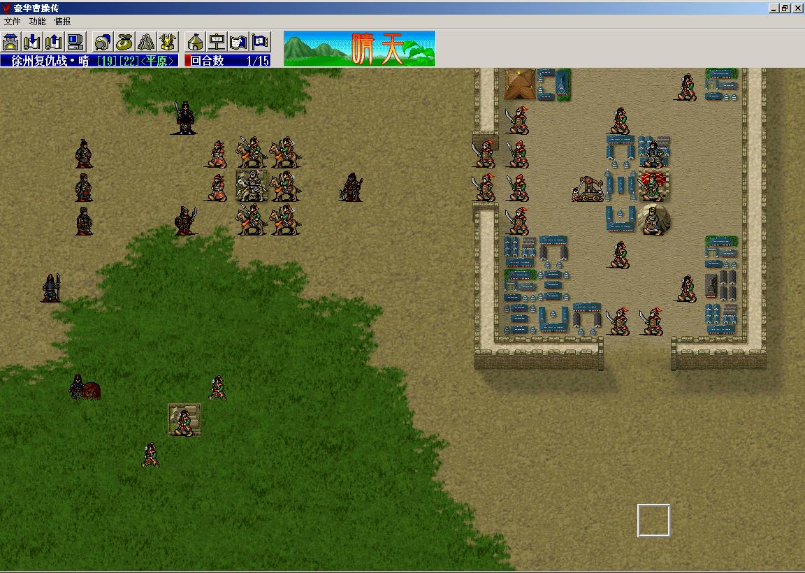 第一回合:用曹操、李典卡位,典韦绕到城门前,勾引中间的敌兵。曹操用风吹,典韦反击再反击,荀攸火烧,李典最后一刀干掉西南角的武术家。