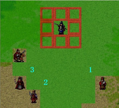 下图中,AI到1234四个格子消耗移动力都相等,1号和3号两个格子靠上,1号比3号靠左,所以AI会选择1号,最终去左边攻击郭嘉。