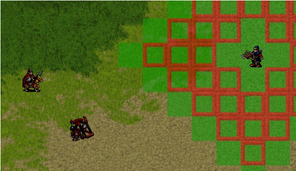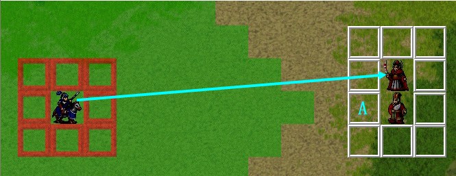 到这里还没结束!上面说过,AI是朝离自己最近的“人”移动,而不是最近的“攻击位”移动。该图中,AI在A框里能攻击到的只有一个敌人,所以最终目标锁定为这个人,然后朝着此人(或者说此人所在的位置)移动。
