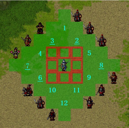 本来在开始判定之前,要画出所有攻击位的上下左右四格。但是连弩兵的攻击范围太大,就不一一画出了。反正从图中可以很直观地看出来,不需要严格地按照规律一来判断。这里只画出最近的几个攻击位和它们的上下左右四格。