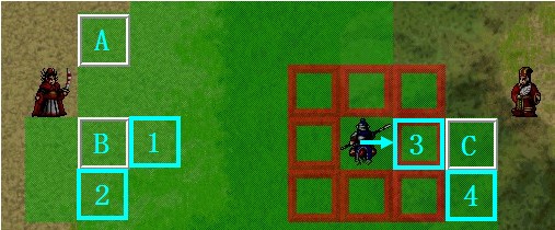 曹操传中的距离计算并不是简单的数一下格子数就行了,还要算上地形对移动力的影响。所以这里不说“距离最近”,而说“移动力消耗最少”。那么这个“位置”又是哪个位置呢?当然不是攻击位置,否则就没必要特别说明了。这个“位置”是指攻击位的上下左右四格。看下图:AI到ABC三个白框的行动价值相等,这三个白框往上下左右各延伸出四个格子,除去对方贴身四格和AI移动范围外的格子,剩下1234四个有效格子。AI到23两个格子消耗的移动力最少,所以会优先选择这两个格子,最终移动到B框。