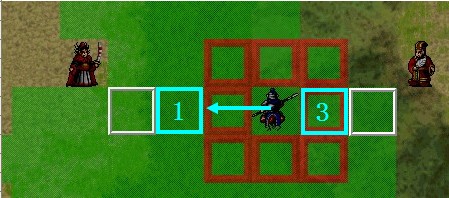 如果把郭嘉右移两格,让AI到1号格子消耗的移动力变为2,AI就会去左边攻击郭嘉。