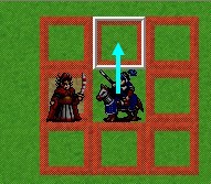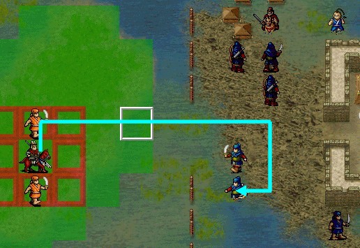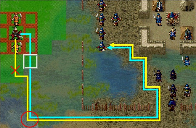 下图,当我军进攻到一定程度,打通吕布通往弓兵的道路时,吕布就会朝着弓兵移动,选择移动力消耗最少的一条路线,按照上右下左的顺序走到图中的白框位置。