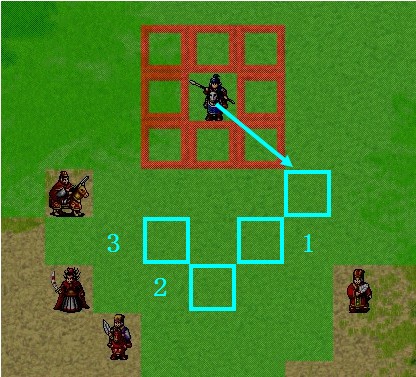 下图两个白框延伸出三个有效格子,1号格子最靠上,所以AI优先选择1号。再根据规律三,最终到右边攻击荀彧。