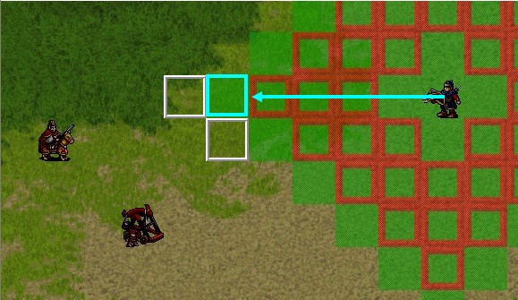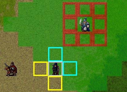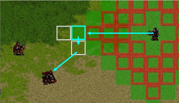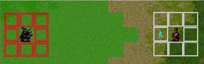 到这里还没结束!上面说过,AI是朝离自己最近的“人”移动,而不是最近的“攻击位”移动。该图中,AI在A框里能攻击到的只有一个敌人,所以最终目标锁定为这个人,然后朝着此人(或者说此人所在的位置)移动。