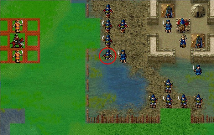 如果下方的孙坚军进攻足够快,先于我军打通道路,那么吕布会往下方移动。下图红圈处是一格浅滩,消耗移动力比沼泽少,吕布肯定会选择经过这格浅滩的路线。但是经过这格浅滩的路线也有好几条,此时就要用到规律五,按照上右下左的顺序,吕布最终会走到下图白框的位置