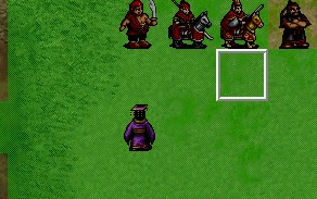 在白框中吕布可以攻击到多个人,根据规律四,AI会选择出场顺序靠后的人。通过查剧本可知,白框右下方那个弓兵的出场顺序比他上面的两个步兵要靠后,所以吕布的目标锁定为这个弓兵,他要朝着弓兵的这个位置移动。但是,所有可以移动到这个弓兵的路线全被堵了(弓兵的上下左右四格都被敌人或者障碍物占据),所以吕布只好不动了。下图中把吕布的移动力修改到255,可以看得更直观。