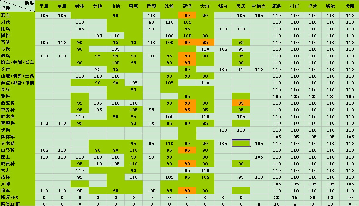 是啊,元帅、骁骑、奇兵、御林在11版中都是通常全地形100的,14版也在这个基础上作了些改动,奇兵、骁骑各加了一个不利地形,御林终于在回复地形可以是105了,不过元帅就被砍了一刀,本来回复地形110的,现在也跟着105了。。。