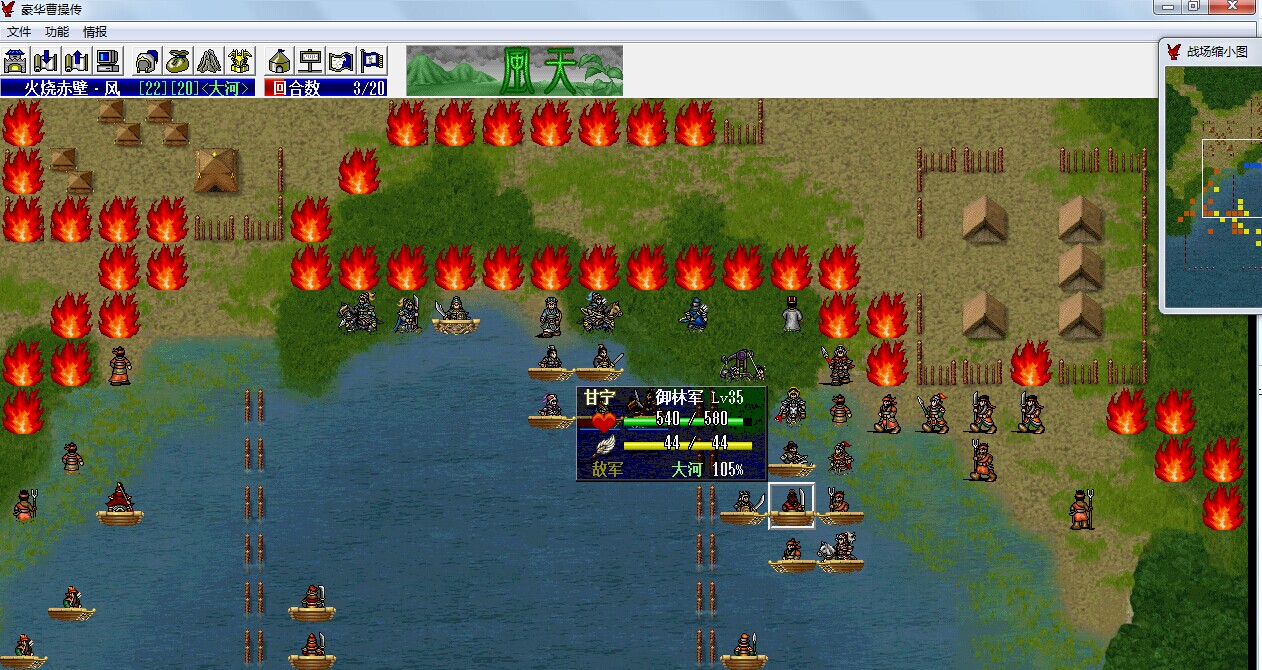 7回合触发灭火,20回合全灭敌军外加逃跑,耗时一晚上,不出场人员,许褚,曹洪,徐晃,3大山地将,精神低不耐打,主要装备,炮车加吸血,于禁黄金甲,典韦干将+象牙+手套,李典青冈+回血+踢云,大夏突破+远程衣+盾,小夏侯虎筋+亮银+的卢,张合龙胆+爆发衣+地形马,思路:主要集中在右手边,优先击杀名将,特别是攻击力高的名将,(别问我怎么杀,于禁+炮车+乐进+典韦,还不死的基本也就剩补刀了)若攻击范围有会补血的文官等,能灭就先灭掉,最后将干将给张辽,绝影给郭嘉,合理跟曹操搭配,一回合可以多走2步路,这关真心很辛苦,敌军全部地形100-110,我方都是大多100及以下,感谢制作组,这关杀得很开心;