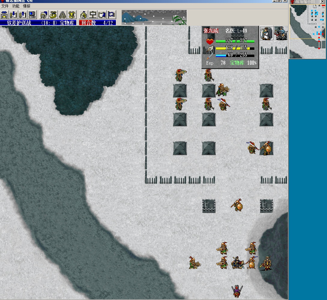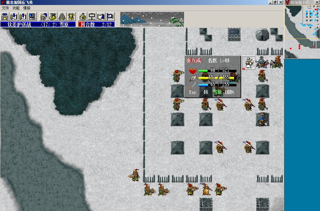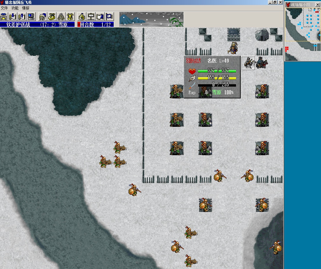 第一回合,张九成走到金术右下,汤怀走到张九成右边不要攻击敌人(因为我开了必杀,一回合清不掉,敌人会秒掉张九成,所以选不攻击)