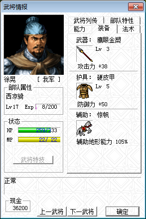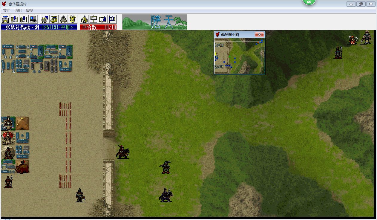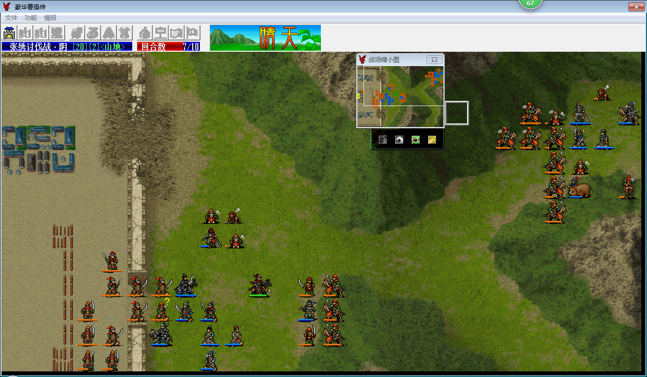 第七回合的时候,小夏侯刚好出双击打掉曹洪前面的骑兵(不双击的话曹洪上一回合打一下这个骑兵也行,我第六回合曹洪选择了打弓骑),为曹洪突破防线去城里拿物品打开了缺口,从进程上来看这个回合走刚刚好,而乐进已经无从选择了,只能加移动一路前行,而且途中不能遇到ZOC的阻挡,所以徐晃也必须加移动进城为乐进掩护,而且移动从距离上来看,徐晃加移动后进城堵路消耗的移动刚刚好,就需要两个强行了,而带遁甲的李典和曹操刚好可以满足这个条件,这些都是我事先没有考虑算计过的,只是大概第六回合的时候我就感觉必须让徐晃往城里靠了,所以楼主才说最后成功全灭是绝地大逆转。第八回合开始基本就没有什么好说的了,上路主要靠小夏侯的反击打出伤害,大夏侯和曹仁主要还是打骑兵,最后剩余1行动力惊险过关。
