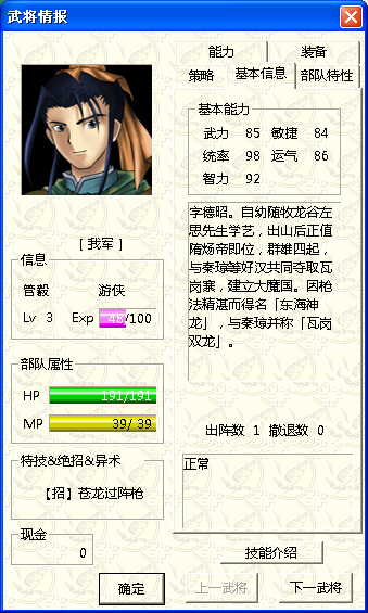 4、武将一览分我军(含友军)和敌军两部分。部队属性(兵种)暗红表示可用印绶转职。