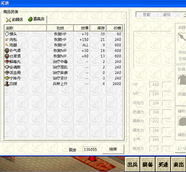 5、持有道具一览可以查看我军装备和道具。装备过多可能存在游戏跳出的漏洞,应该及时卖掉没用的陈旧装备。
