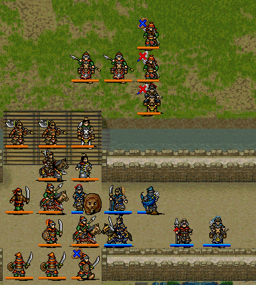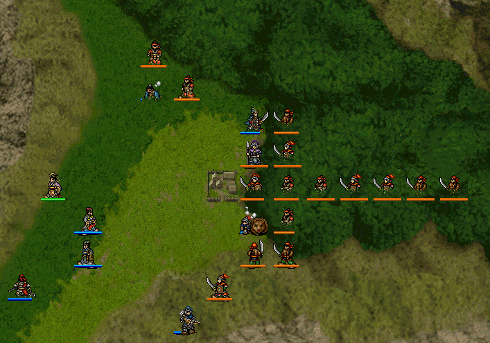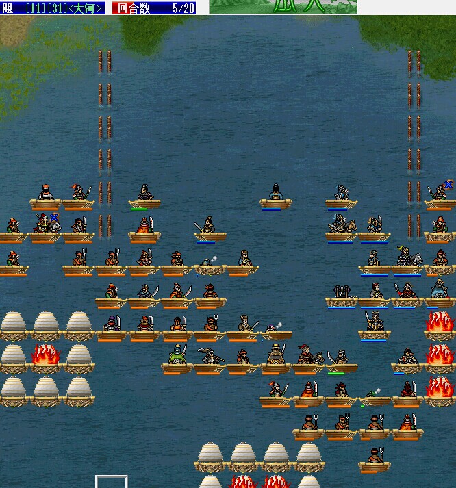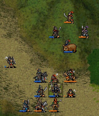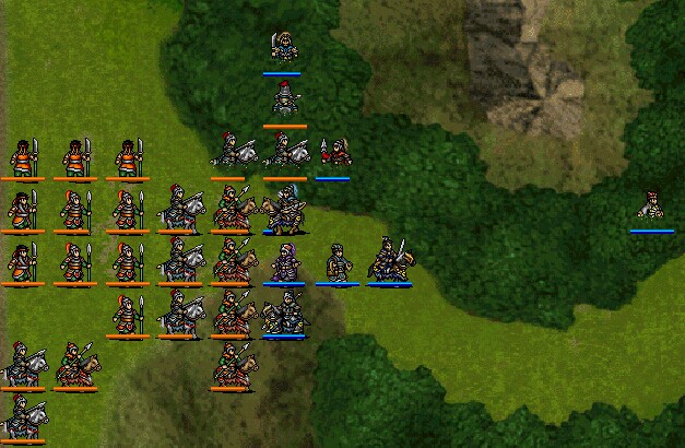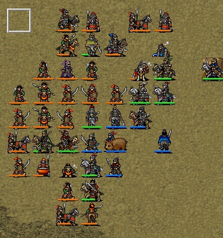 第一回合孙坚后撤,集体往前走一点,小夏侯走到袁绍前面步兵的斜下方把敌人的一个步兵勾引过来砍他(还有个弓兵也会过来射他)敌军阶段黄盖程普撤退。