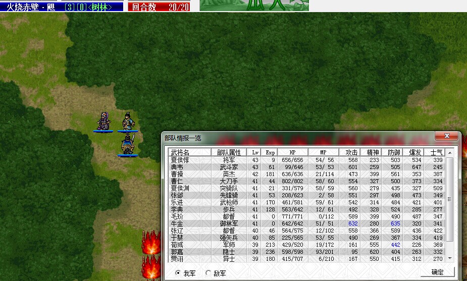 清的差不多的时候害死华雄再去慢慢清李肃那帮人时间完全来得及(这里曹仁 乐进都可以进树林打,为了经验多一点,输出少一点,我在平原打的)