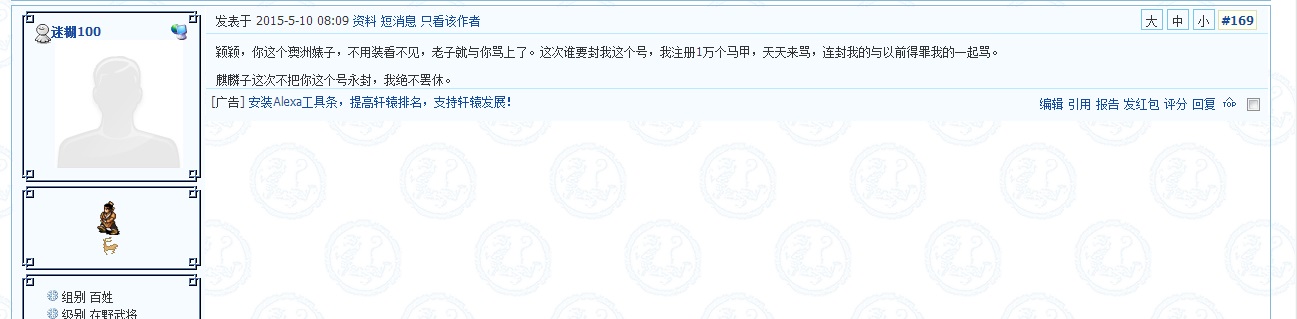 会员迷糊100用千人骑万人压,婊子,卖国贼等字眼侮辱颖颖,应永封