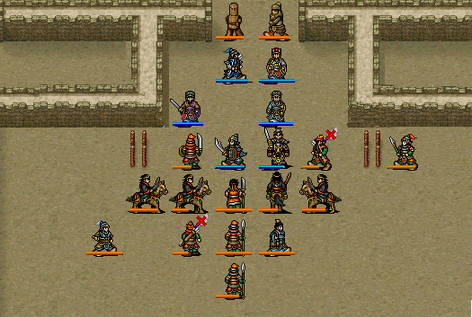 曹操给典韦加血,典韦回到曹操的位置继续揍步兵。郭嘉给徐晃加血,徐晃跟李通站位输出。曹洪去把凤凰换给曹操。其他人干掉门口的长枪兵和他下面的弓兵,李典走到那里。见第七回合: