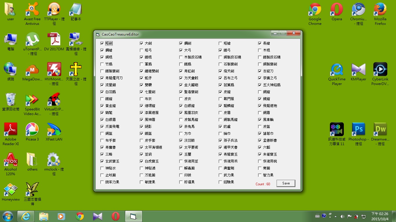 首先用CaoCaoTreasureEditor放在曹操傳MOD的路徑下,開啟修改需要顯示的寶物,最後記得按下Save,記下Count的數字(寶物圖鑑數量),下面會用到。