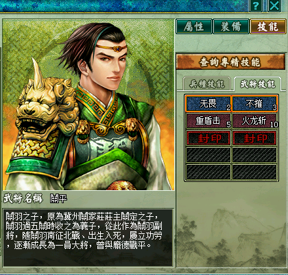 介绍和评价:在练级比较缓慢的时代,关平无疑是一个强力的步兵,一个优秀的关平,主要有:无畏、不摧、火龙斩、重盾击这四个天赋技能,前面两个是被动防御加成,可以不理会,火龙斩是单体攻击,重盾击是机率击晕。总体来说攻击性就不是很强,前期的主要肉盾,再加上有宝典效果,值得珍藏,练级比较快的可以不用理会他,守仓库即可。