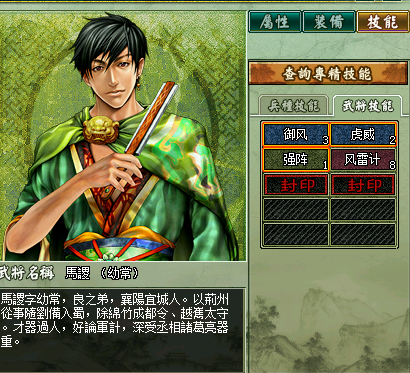 介绍与评价:与同为65级将的魏国曹植相比,马谡就是一个渣,缺乏强力的群体法术是致命伤,好在这货是宝殿将,可以集邮,留着守仓库吧。