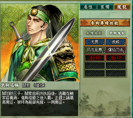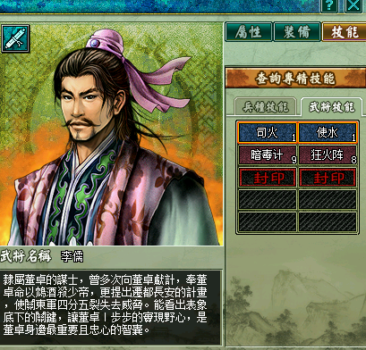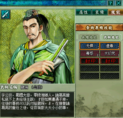 按说我军已经有简雍糜竺两个医生,可两个大叔怎么比得上美女太后呢,医生是不可缺少的兵种,像何太后这种既养眼又实用的队员,自然是多多益善。买不起华佗和张医生的玩家有福了 。何太后的四个天赋技能为无惧、真御咒、剧毒、捆仙风(有说她带仁心的,反正我没见过)。对医生而言,攻击技能没什么用,个人觉得捆仙有没有无所谓,留着位置打书比较好。