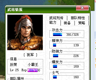 就比如孙策,100武力,武器74攻击力,兵种是SS攻根据表格是7攻,东吴志初始账面是5维一半,所以是50+25x7+74=299,但是我给他吃一个武力果后