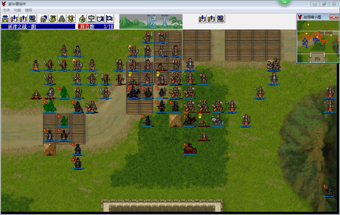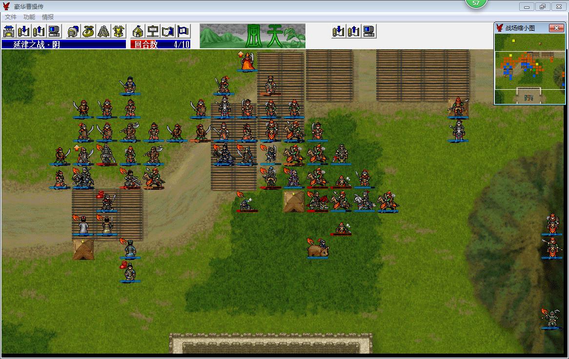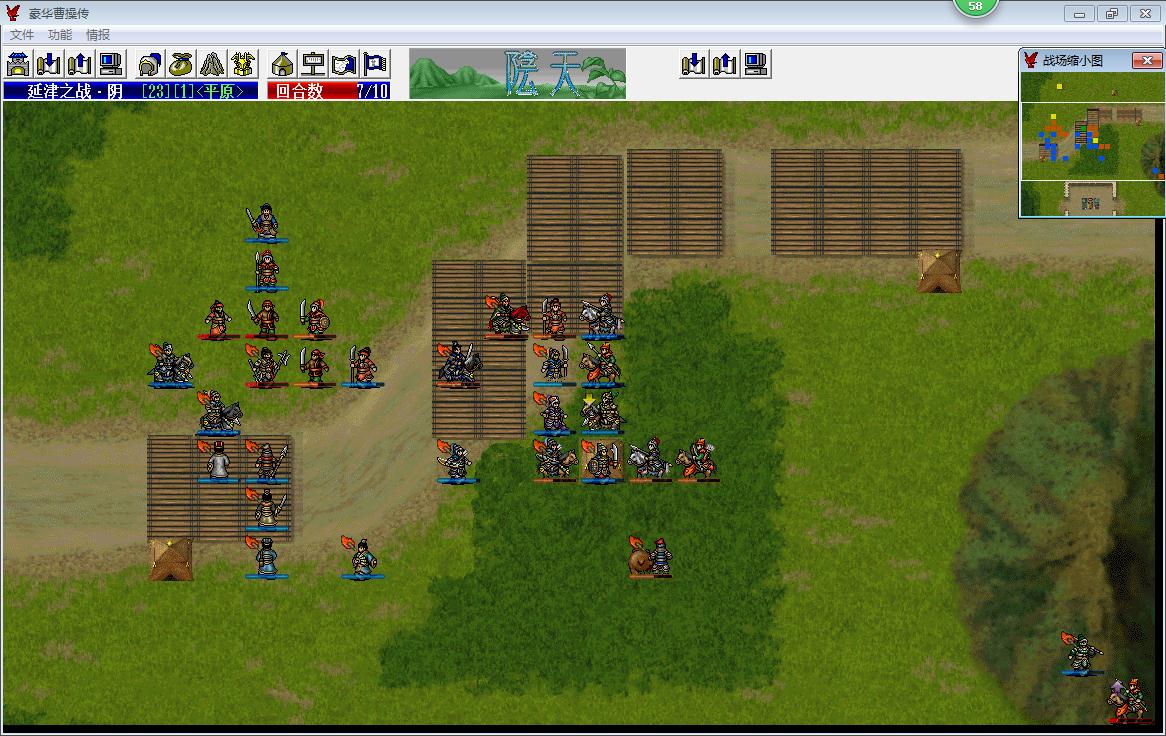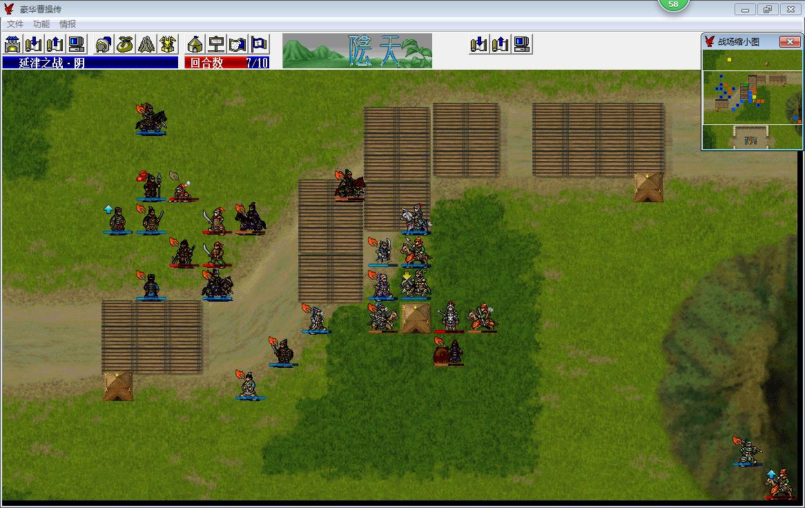 豪曹基本上所有的关卡都是我军以寡击众,面对数倍与已的敌军,很多玩家玩玩很容易陷入敌军的节奏。战争基本上都是空间的争夺,曹操传这种战棋基本也是如此,基本上我军的优势在于人员装备素质相对占优,能够在局部的空间上获得优势,我的战术理念基本是可以暂时放弃部分的空间,集中优势兵力各个击破。而这个击破比较重要的就是优先击破敌军的重要人物,一般是文官和远程部队,这些兵种一般行动顺序比较靠前,只要我们事先挖下坑,最先掉下去的就是他们。我这篇战报比较重要的地方就是通过断不的挖坑下套把敌军威胁较大的文官和远程快速坑杀。