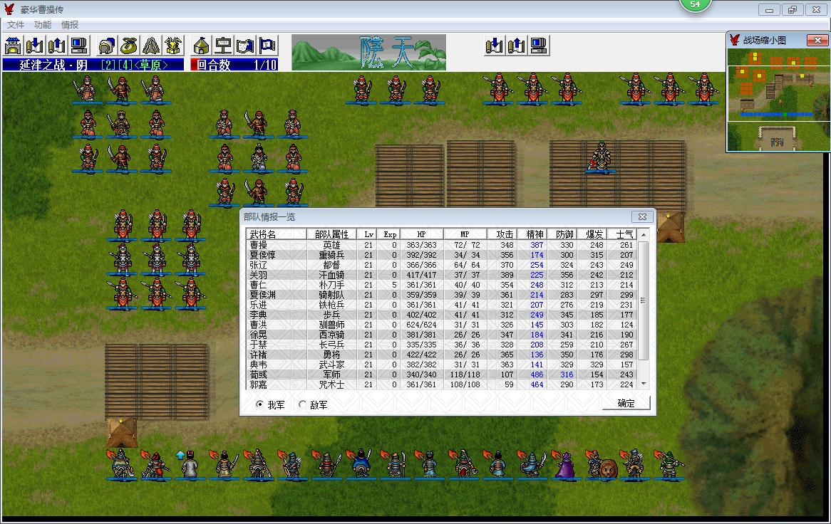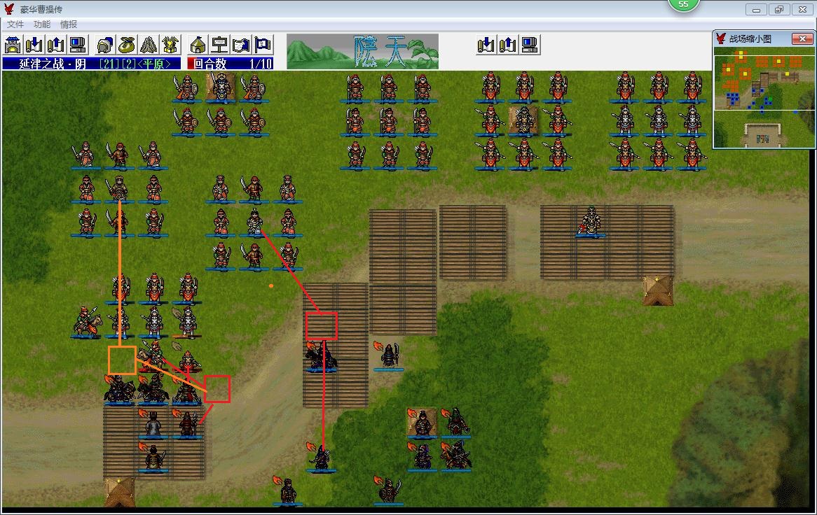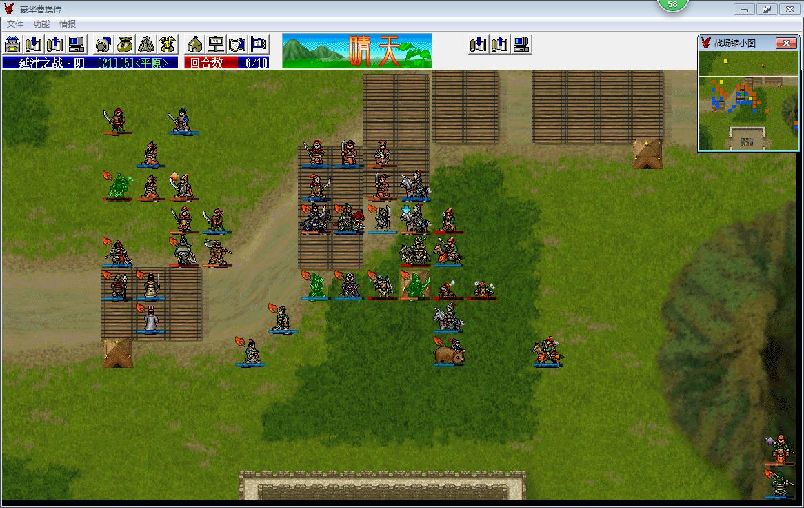 豪曹基本上所有的关卡都是我军以寡击众,面对数倍与已的敌军,很多玩家玩玩很容易陷入敌军的节奏。战争基本上都是空间的争夺,曹操传这种战棋基本也是如此,基本上我军的优势在于人员装备素质相对占优,能够在局部的空间上获得优势,我的战术理念基本是可以暂时放弃部分的空间,集中优势兵力各个击破。而这个击破比较重要的就是优先击破敌军的重要人物,一般是文官和远程部队,这些兵种一般行动顺序比较靠前,只要我们事先挖下坑,最先掉下去的就是他们。我这篇战报比较重要的地方就是通过断不的挖坑下套把敌军威胁较大的文官和远程快速坑杀。