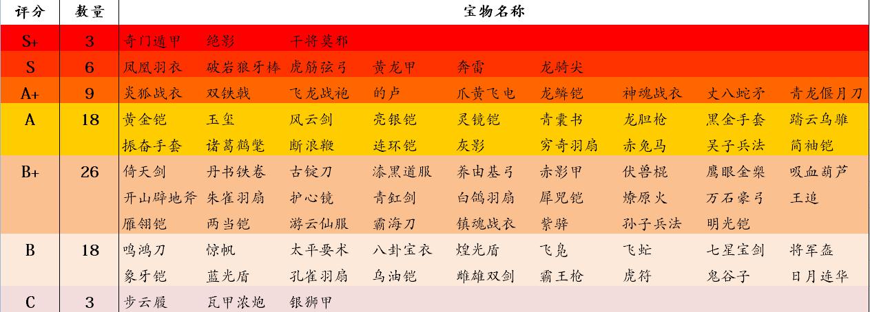写这类东西说实话并非我所长,我尽量追求客观实际,但是很多分析和评价难免会出现一些错误和不足之处,特别是评级很容易出现争议,总之欢迎吐槽就是。这里简单说一下宝物等级评价的主要标准: