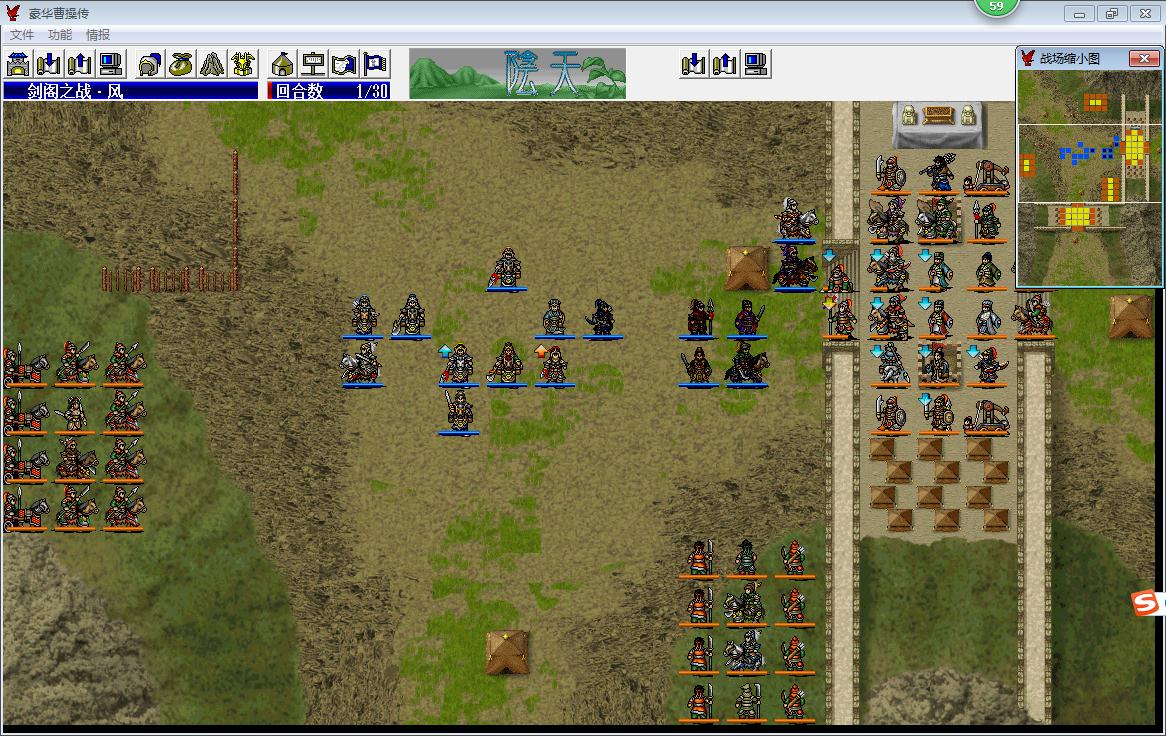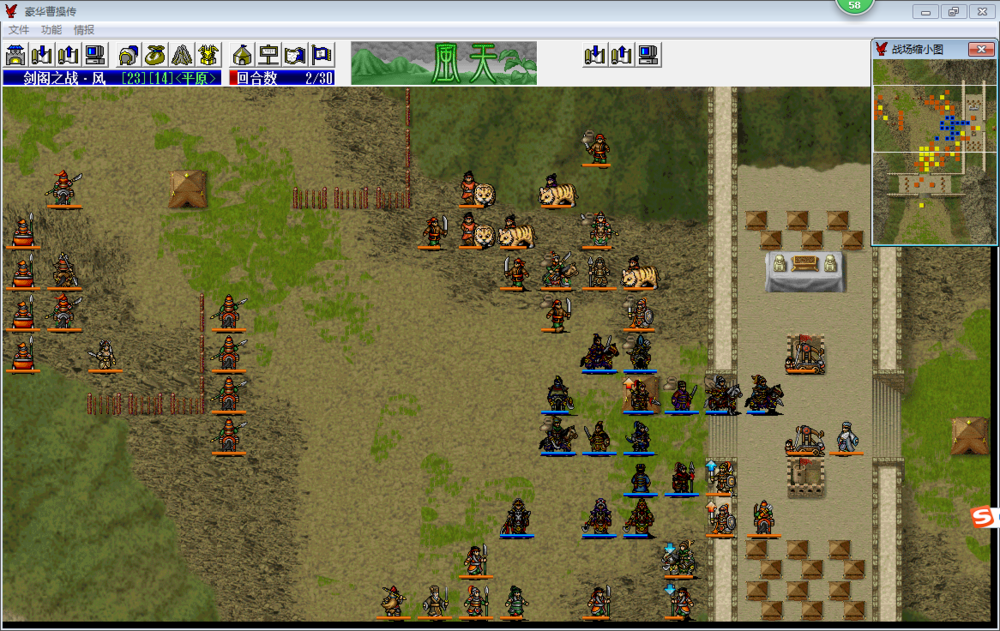 剑阁的敌军算是动用了吴蜀两国剩余的全战力,总人数是80人,其中名将34人,数量占据将近一半,非常可怕。因此,优先击杀敌军的名将,尤其是杀伤力巨大的武将和会补给的文官非常重要,如果开局了杀了过多的小兵,由于我军不断有人员撤退,很容易造成后面我军和敌军的实力对比严重失衡。所以,开局对敌军关外步兵攻击范围的小兵最好不要先杀,远程能忍则先忍,集中力量剿灭敌军名将,前面六七回合杀敌军名将的占杀敌总人数的比例最好能达到七成以上,后面打起来就会相对轻松很多。