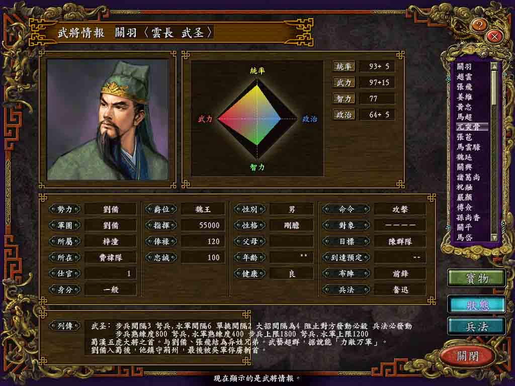 大家可以看出, 赵云是弓骑专精, 黄忠是弩兵专精, 关羽是步兵专精+单挑王, 马超是骑兵专精, 张飞是暴击男, 魏延专司防守. 而谋士们也有各种专精, 比如杨仪这种是辱骂专精. “兵法必发动”这项能力在武官中只有五虎,吕布,三大君主和少数几个专攻此技的人习得. 而对于文官, 真正稀罕的能力是”奇门遁甲”(武力兵法必抵抗且免疫狙击), 只有半神级别的谋士才拥有此能力. 而且只有卧龙凤雏免疫伪报扰乱(拿掉了原来版本里面一堆的伪报扰乱免疫, 因为不想用计的时候还要一个个地去看对方部队里谁是免疫的 ).