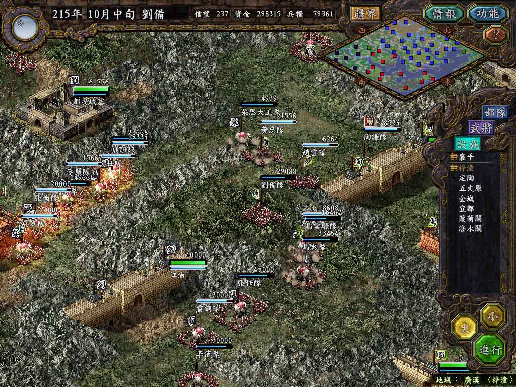 刘备:入川受挫,转而攻下襄平(原梓潼),兵力30万. 虽强敌四顾但西有涪水关拒刘焉, 北有剑阁天险拒曹操, 东面宜都城塞和五丈原关隘互为犄角对抗东吴(但刘焉占据金城城塞), 手下猛将如云(87员将领), 除了一些蜀将, 几乎所有和刘备沾亲带故的都来帮忙了, 尤其是家园被刘焉所灭, 愤而投奔刘备的祝融一家. 且四方人民闻听皇叔有难, 纷纷进献宝物, 以助皇叔得脱此难.