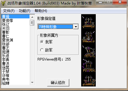 3:用了叶落秋寒的战场形象指定器指定人物形象,也按照置顶的帖子改了EXE形象地址5E7E-5E7F处的AD 00,改为00 02,可是战场形象指定器还是只能指定255个人物形象,255以后的人物形象都看不到,实际在S剧本也没有起到作用,不知道是哪里出的问题,如下图