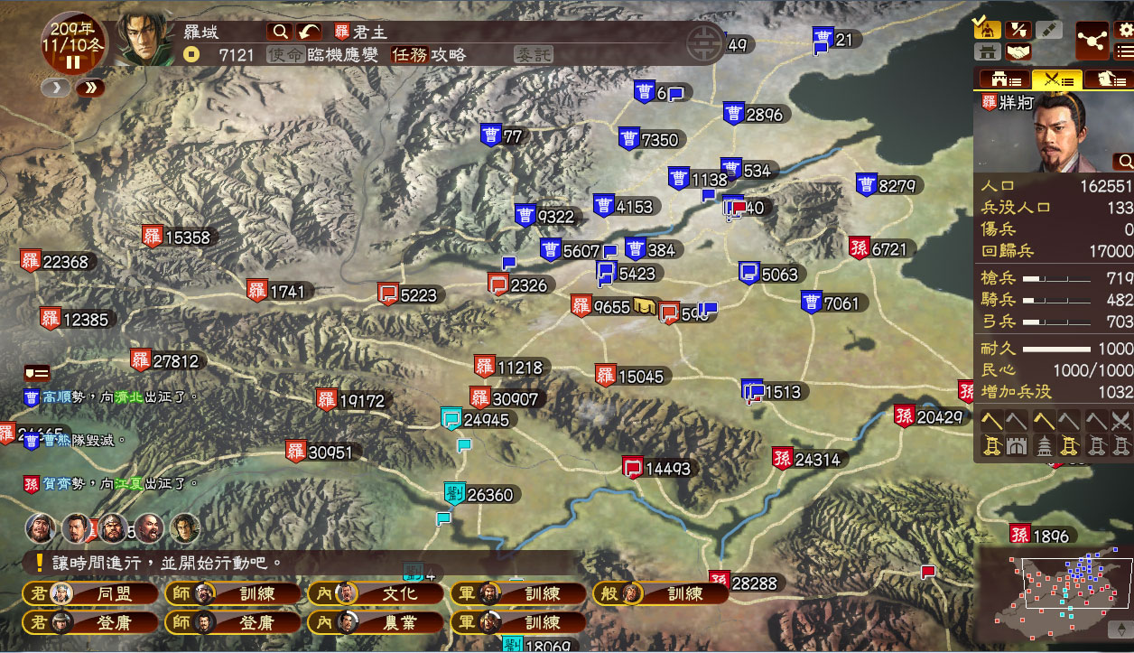 曹老板总共才60万兵,除了广陵寿春宛三个边境城兵不动,其它城每个城留几千人,这是举倾国之兵来犯