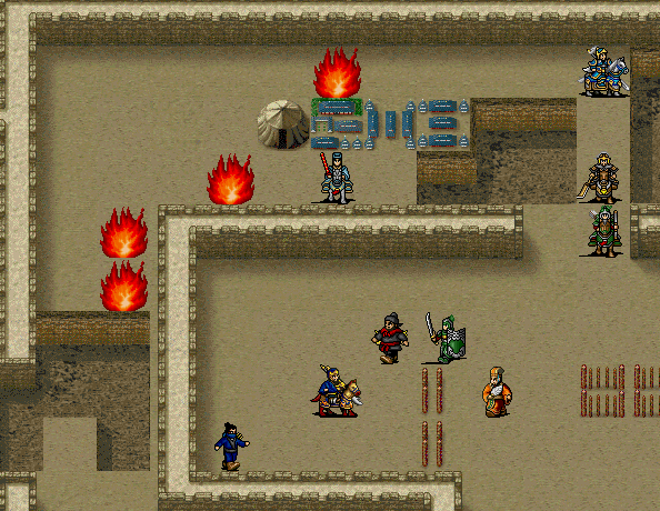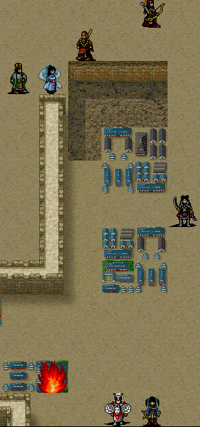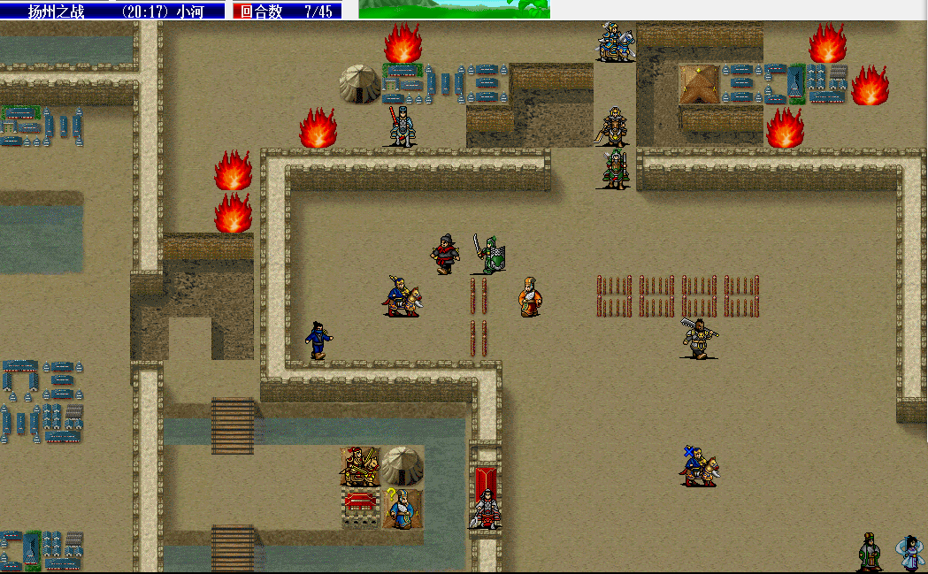 第七回合友军持续围殴上面的雄狮和刺客。上方的伍云召和弓骑冲入战团,窦建德往下走,再下一回合去砍中间那个麻痹的雄狮。苏烈原地不动放技能