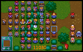 上边魔导耗光及亚克魔补后,闲人捡右边箱子和门口左边暗箱(力量药水),盖亚继续清敌(早先怕不够杀,布兰多往上送,结果有富余,裘娜清掉)。19回合我方站位及高级援军出现后形成下图10020,其中盖亚上一为低级骑兵。