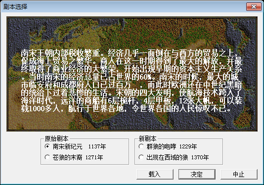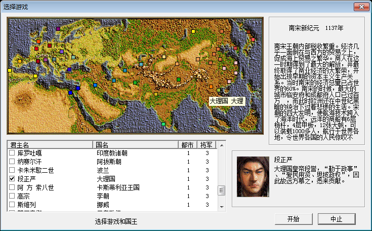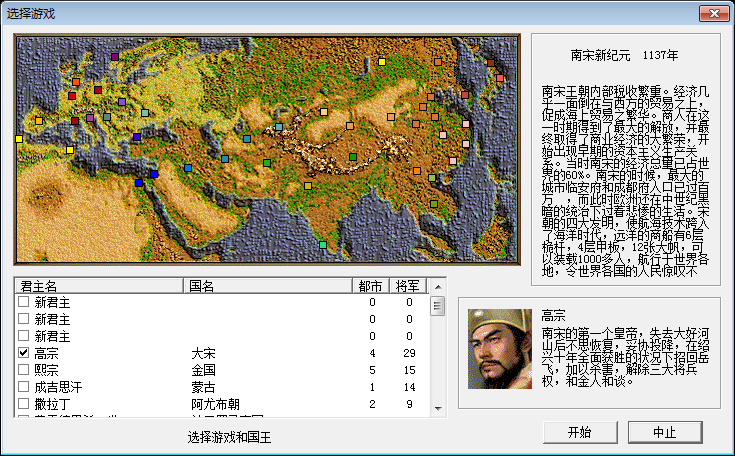 因为无法在WIN7的系统下修改绘制地图山脉,所以只能暂时以城墙为山脉替代,以后会找个机会用老机器来换地图,并且用英雄无敌3的地图编辑来替换一个新的世界地图,目前的蒙古早出生70年,下个版本会把铁木真等人全部挪移回70年后,好了上图