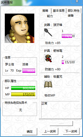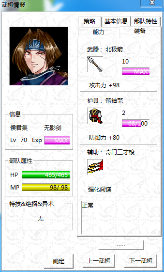 2、六军镜形势和破甲剑给师姐以便定点清除某些位置的敌人。我方回合保证504点输出,足以秒杀箭车、锤骑以外的普通小兵。
