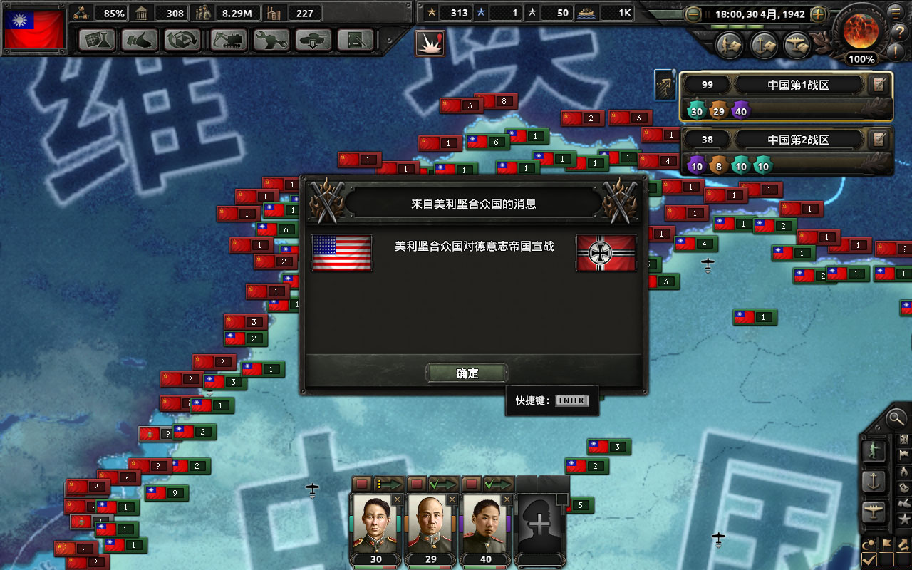 国军总共110个师,守备师10个,伞兵师10个.5步4炮王牌步兵师30个.刚扩编过的14步3炮3反坦大编制步兵师10个.7步2炮标准步兵师50个