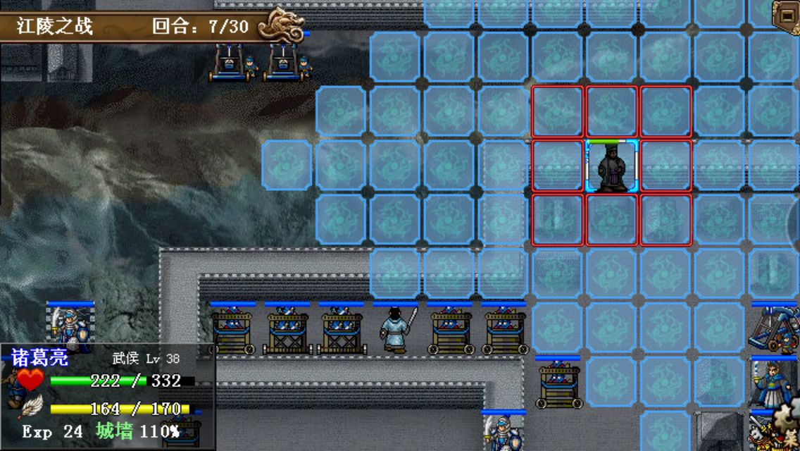 第一回合:诸葛亮左移四格进入山崖,其他人给赵云加攻加防吃个圣经验果,基本在原地待命