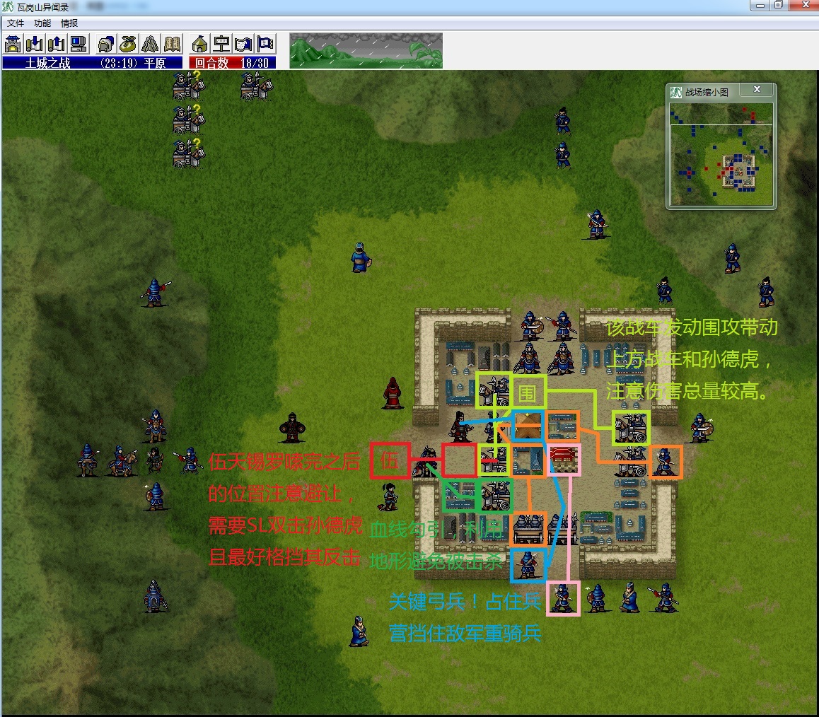 (3)管毅血量蹭到85~87(87是孙德虎站在120%地形能秒杀管毅的血线,不建议低于85,因为孙德虎实际伤害浮动在58~64,而弓兵在城内攻击管毅的面板伤害是24,留一点SL余地比较好)。