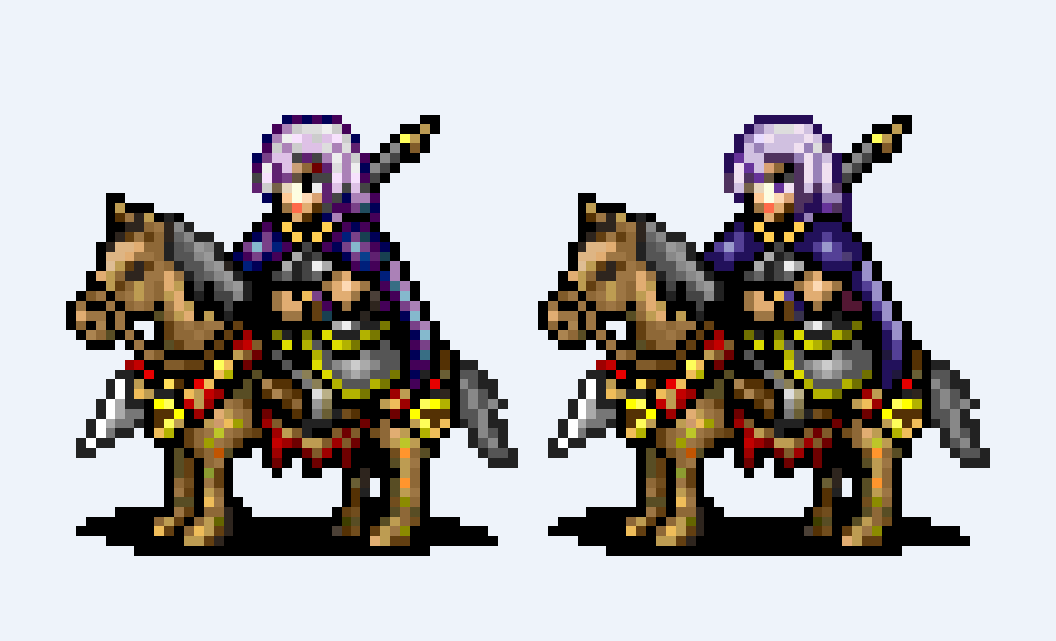 在转换中存在一定的损失和自动补全,以孙策为例,放大之后来对比。左为下载的256色,右为预览的真彩,可以看出头发、肩铠、护手和披风,还有手臂和披风之间存在的不同。
