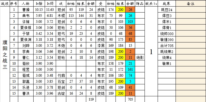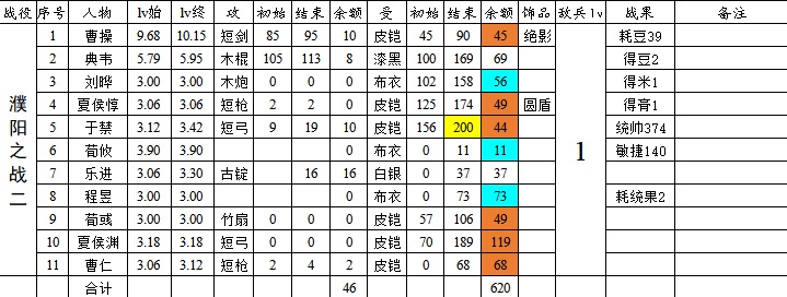 对照以上,因为无撤退,汜水不可能这么多;虎牢不撤退袁绍不能出击,要求刘备必须活,也打不到;董卓600是正常水平;黄巾肯定是300;徐州恢复地形多,敌人弱且分散,900+不是不可能,可以拼一下;濮阳一、二没有赤兔、黄爪情况下,肯定会逊色很多;濮阳三600+正常水平;献帝因为我要全歼,会损失100+,达不到;张绣一打法很固定,正常750左右;寿春目标低,无难度;张绣二调剂好的话,可以破千(第一章唯一有机会破千的);杀吕布两战目标低,难度不大。