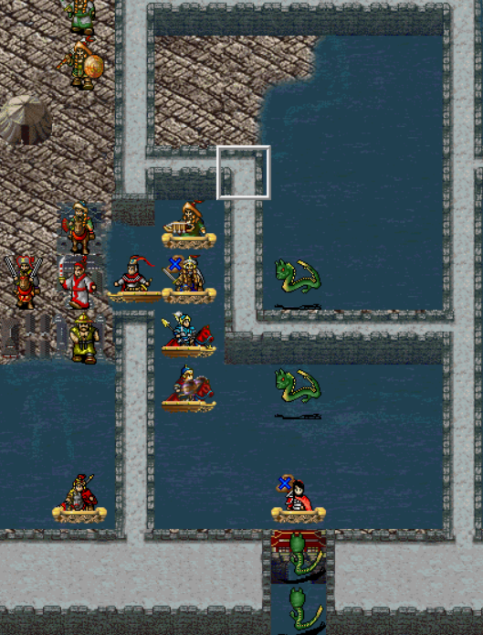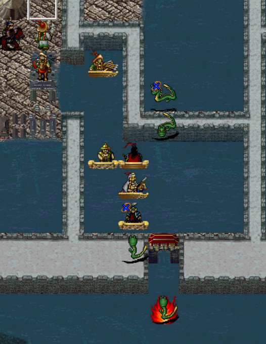 右边,王佐装备9级碧玉梨花袍和火龙驹,走到如图位置给步兵降防御,这样敌方回合,两个鱼鳞军可以把他打出特技。