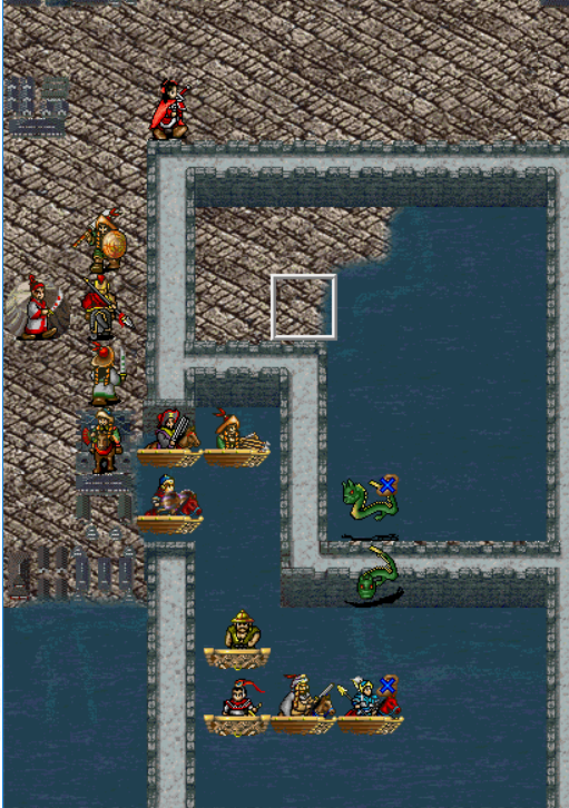 右边,王佐装备9级碧玉梨花袍和火龙驹,走到如图位置给步兵降防御,这样敌方回合,两个鱼鳞军可以把他打出特技。