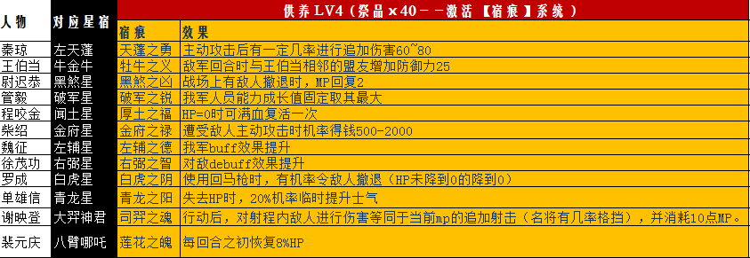 第四步,继续供养40个祭品,解锁“供养LV4”,激活星官的究极元力——“宿痕”(每名星官的宿痕都有独立的名称),由此启动相对强力的天赋或技能。但要想正式激活宿痕,必须先使元力达到LV3(满级)。